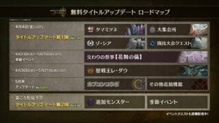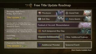 Ogni stagione, si terrà una celebrazione unica nel Grand Hub. Questi inizieranno con il Festival di Accord: Blossomdance, che va dal 22 aprile al 6 maggio. Durante i festival, l'aspetto e i pasti disponibili nel Grand Hub cambieranno e i cacciatori possono ottenere attrezzature a tempo limitato, gesti, decorazioni a pop-up e altro ancora. Oltre alle missioni di eventi stagionali, anche la maggior parte delle missioni di eventi in precedenza faranno un ritorno. Rey dau irato arco apparirà come parte di una ricerca di eventi alla conclusione del festival a maggio. I cacciatori dovrebbero tenere gli occhi aperti per una prossima collaborazione Capcom con un altro titolo verso la fine del mese!