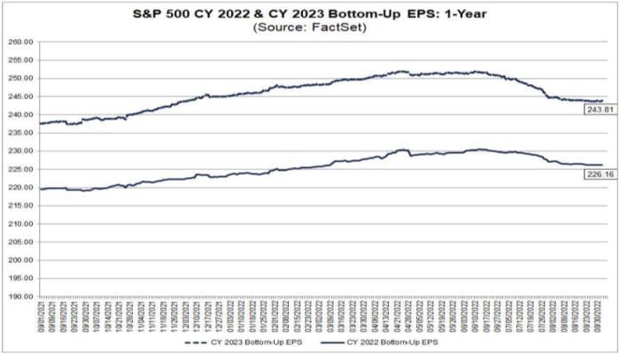 Gli analisti di Wall Street non stanno ancora valutando nulla che assomigli a una recessione il prossimo anno. Ecco il grafico di FactSet dell’evoluzione delle stime di EPS per quest’anno e il prossimo per l’S&P 500. Entrambi sono scesi di alcuni punti percentuali, ma si prevede che gli utili del 2023 aumenteranno nettamente rispetto al ’22: