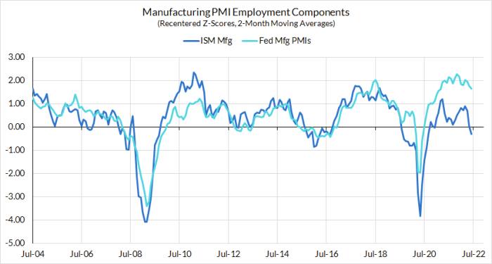 Skanda Amarnath di Employ America ha sottolineato Twitter ieri che le componenti occupazionali dei sondaggi regionali della Fed, che ritiene più affidabili, sembrano più ottimistiche rispetto alle controparti ISM. In questo grafico traccia la produzione ISM, in blu scuro, contro una media dei sondaggi della Fed, in ciano. Gli indici occupazionali della Fed stanno dipingendo un quadro di forti assunzioni, mentre l’ISM è in calo: