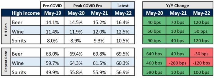 Citando i dati di Numerator Insights, RBC afferma che per le famiglie a basso reddito (definite su $ 40.000 o meno), il consumo ha raggiunto il picco durante i giorni apocalittici di marzo 2020. Da allora, gli acquisti ripetuti di birra e vino hanno avuto un trend negativo.