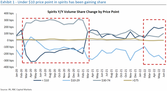 Il punto debole della pandemia nel mercato degli alcolici era di $ 30- $ 74 a bottiglia, che è il territorio di Cîroc vodka e Hennessy VSOP. I controlli rigidi e la noia del blocco si sono combinati per aumentare la quota del marchio di fascia media di circa 2,5 punti percentuali, il che è avvenuto principalmente a scapito delle cose più economiche. Questa tendenza si è invertita all’inizio del 2021 e si è rafforzata da marzo 2022 poiché cibo, benzina ecc. consumano più reddito disponibile.