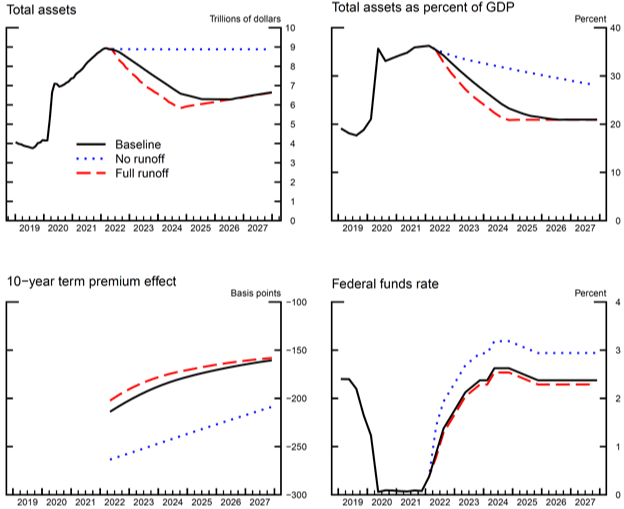 Il documento propone che lasciare 2,1 trilioni di dollari di asset fuoriusciti dal bilancio della Fed fino alla fine del terzo trimestre del 2024 equivale ad aumentare il tasso sui fondi federali di 56 punti base. I ricercatori della Fed ottengono quel numero confrontando due simulazioni modello dell’economia statunitense, una con il deflusso del bilancio (linea nera sotto) e un’altra in cui la Fed continua a ribaltare le sue partecipazioni mentre maturano (linea blu tratteggiata). Simulano anche un ritmo leggermente più veloce del deflusso di bilancio (linea rossa tratteggiata). I grafici in alto mostrano la contrazione del bilancio della Fed e i grafici in basso mostrano quale sarebbe l’aumento del tasso equivalente: