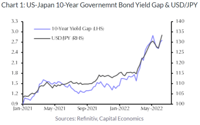 Lo yen, per semplificare un po’, viene scambiato sul divario tra i rendimenti obbligazionari statunitensi e giapponesi, che attira flussi di capitali e trasporta scambi sulla sua scia. Tale divario è stato ampliato dall’inflazione statunitense e dal “controllo della curva dei rendimenti” – il tetto imposto dalla banca centrale giapponese sui rendimenti obbligazionari a 10 anni.