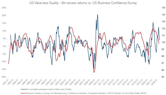 Michel Lerner, che dirige il gruppo di ricerca sulla valutazione HOLT di Credit Suisse, ne fornisce una buona illustrazione, rappresentando graficamente l’eccedenza di rendimento dei titoli value rispetto ai titoli di qualità (linea blu, asse sinistro) confrontati con un grafico e un indice della fiducia delle imprese statunitensi, un indicatore delle condizioni economiche (linea rossa, a destra). I grandi recuperi della fiducia sono seguiti dalla sovraperformance del valore e la fiducia crolla dalla sovraperformance della qualità.