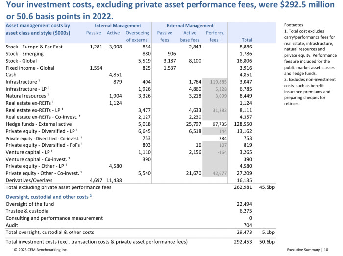 Tutta questa gestione esterna non è economica. NZSF Studio di valutazione dei pari di CEM Benchmarking pone i costi di gestione esterna a NZ$185 milioni all'anno, di cui le commissioni degli hedge fund rappresentano ben NZ$123 milioni. Poi ci sono gli ulteriori NZ$202 milioni che hanno pagato in commissioni di performance degli asset privati. I costi totali di investimento (escluse le commissioni di performance degli asset privati) erano poco più di 50 punti base del valore degli asset, circa due volte e mezza la quota spesa da CalPERS: