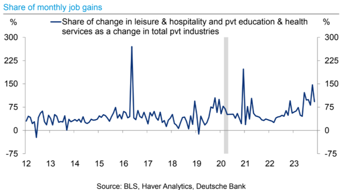 Un’ultima preoccupazione: la composizione settoriale dei guadagni occupazionali appare disomogenea. Il settore privato sta aggiungendo posti di lavoro soprattutto in due aree: tempo libero/ospitalità e istruzione/sanità privata. Questi due hanno costituito il 75% degli aumenti dei salari privati nell’ultimo anno. Ciò è anormale, come illustrano gli economisti di Deutsche Bank nel grafico seguente (che mostra questi due settori come quota dei guadagni netti mensili di posti di lavoro):