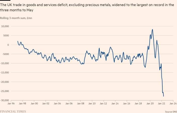 Si stanno battendo record in Gran Bretagna, e non solo per le temperature. Gli ultimi dati dell’Office for National Statistics mostrano che il Regno Unito ha registrato il suo più ampio disavanzo commerciale dall’inizio delle registrazioni nel 1997.