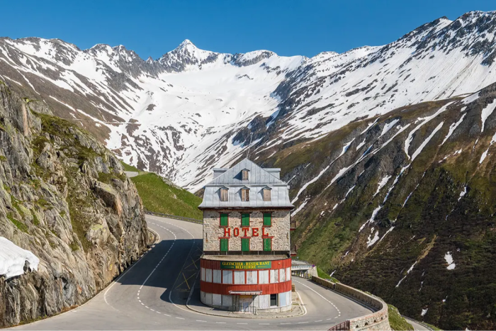 Sono arrivato in ritardo alla festa, ma di recente mi sono imbattuto in Accidentalmente Wes Anderson, un sito web che esplora “l'unicità, la simmetria, l'atipicità, il design distintivo e l'architettura straordinaria che ispira tutti noi”. Se mi seguite in questa tana del Bianconiglio, tra i luoghi più famosi che troverete c'è il Hotel Belvedere nelle Alpi svizzere. Forse lo ricorderete dal 1965 James Bond film Dito d'oro. Bond, interpretato da Sean Conneryattraversa il passo della Furka a bordo della sua Aston Martin argentata mentre insegue il cattivo Dito d'oro e il suo scagnozzo Strano lavoro in una Rolls-Royce gialla e nera.